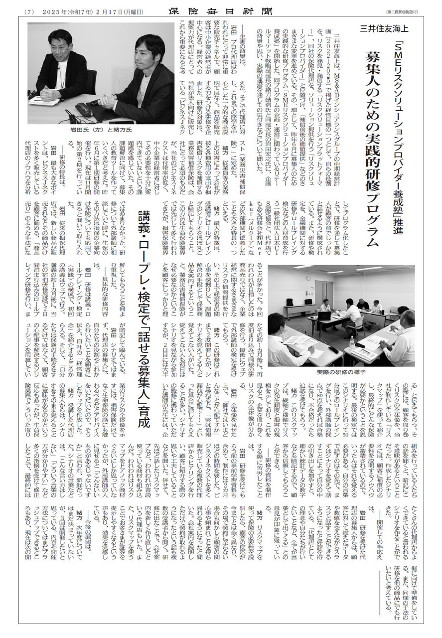 『保険毎日新聞』2025年2月17日号に三井住友海上様にて実施している研修プログラムについて記事が掲載されました
